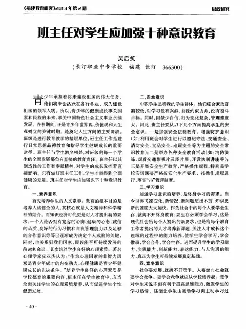 当代班主任应具备的十大意识在施行素质教育和现代化教育的过程中,班主任的意识非常重要,因为意识源于存在,思想指导行动。
