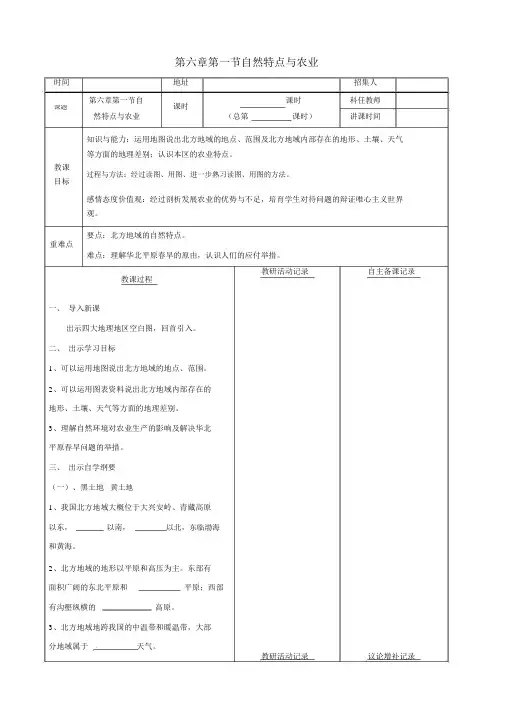 第六章第一节自然特点与农业时间地址招集人第六章第一节自课时课时科任教师课题然特点与农业(总第课时)讲课时间知识与能力:运用地图说出北方地域的地点、范围及北方地域内部存在的地形、土壤、天气等方面的地理差别;认识本区的农业特点。