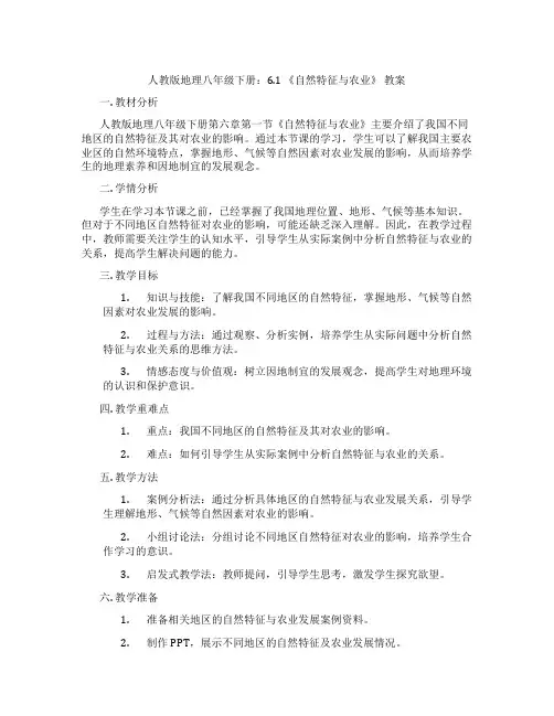人教版地理八年级下册:6.1 《自然特征与农业》教案一. 教材分析人教版地理八年级下册第六章第一节《自然特征与农业》主要介绍了我国不同地区的自然特征及其对农业的影响。
