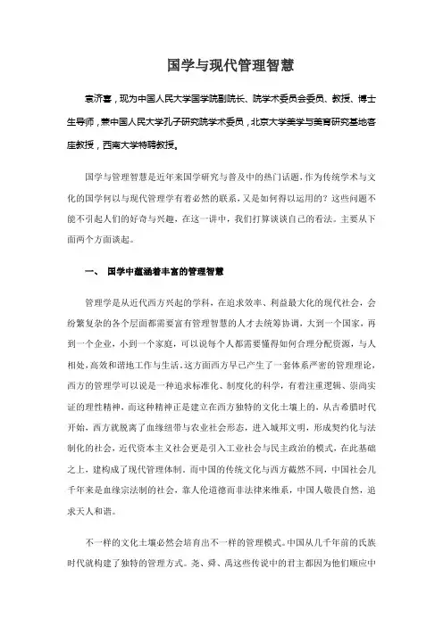 国学与现代管理智慧袁济喜,现为中国人民大学国学院副院长、院学术委员会委员、教授、博士生导师,兼中国人民大学孔子研究院学术委员,北京大学美学与美育研究基地客座教授,西南大学特聘教授。