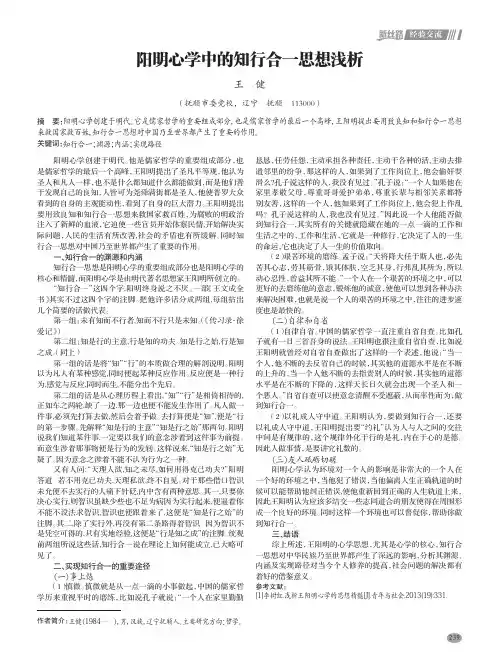 一、知行合一的渊源和内涵知行合一思想是阳明心学的重要组成部分也是阳明心学的核心和精髓,而阳明心学是由明代著名思想家王阳明所创立的。