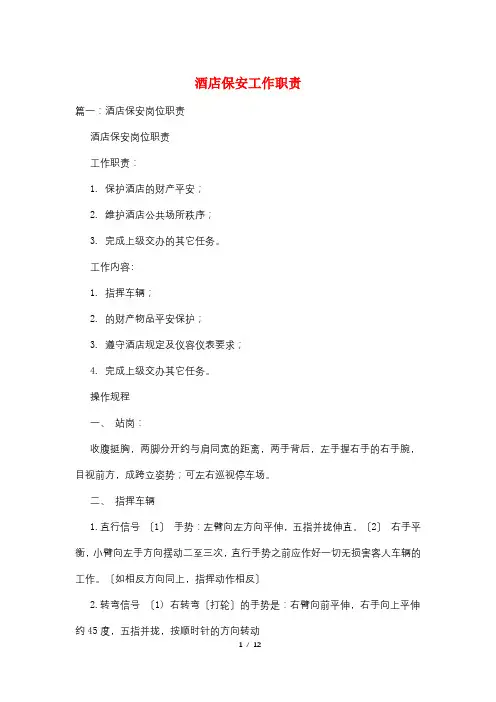 酒店保安工作职责篇一:酒店保安岗位职责酒店保安岗位职责工作职责:1. 保护酒店的财产平安;2. 维护酒店公共场所秩序;3. 完成上级交办的其它任务。