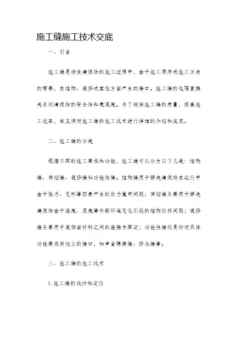 施工缝施工技术交底一、引言施工缝是指在建筑物的施工过程中,由于施工顺序或施工方法的需要,在结构、装修或其他方面产生的缝口。