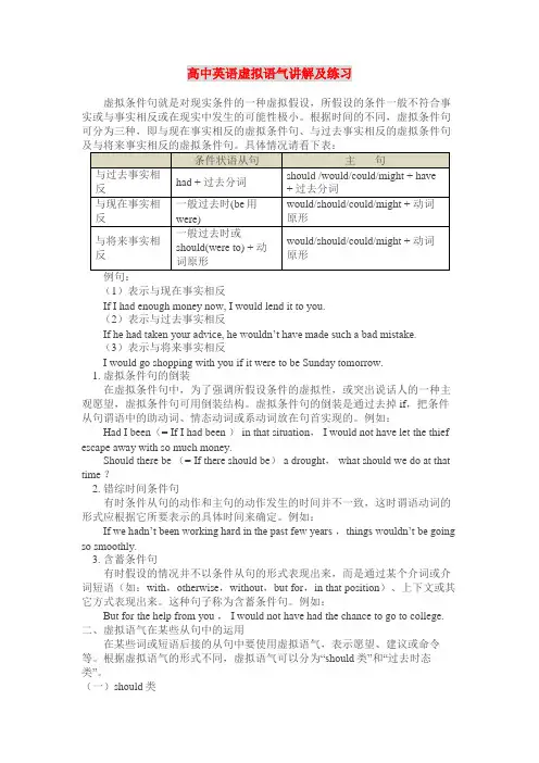 高中英语虚拟语气讲解及练习虚拟条件句就是对现实条件的一种虚拟假设,所假设的条件一般不符合事实或与事实相反或在现实中发生的可能性极小。