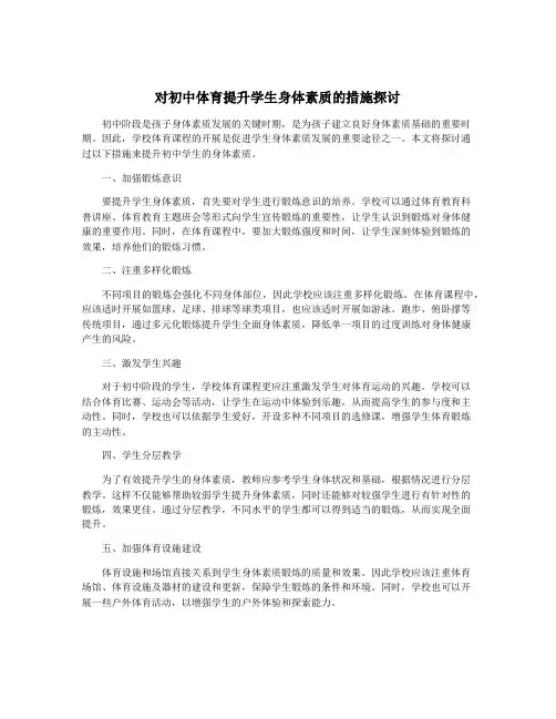 对初中体育提升学生身体素质的措施探讨初中体育作为学生身体素质的重要组成部分,对学生的身体健康和全面发展起着至关重要的作用。