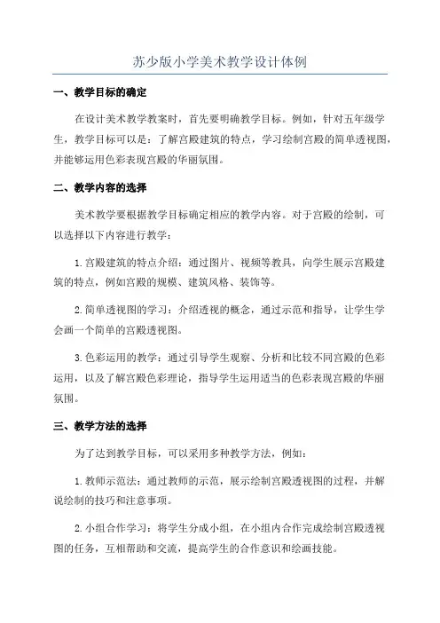 一、教案简介本教案是根据苏少版美术教材编写的一套示范教案,旨在帮助教师更好地进行美术课堂教学。