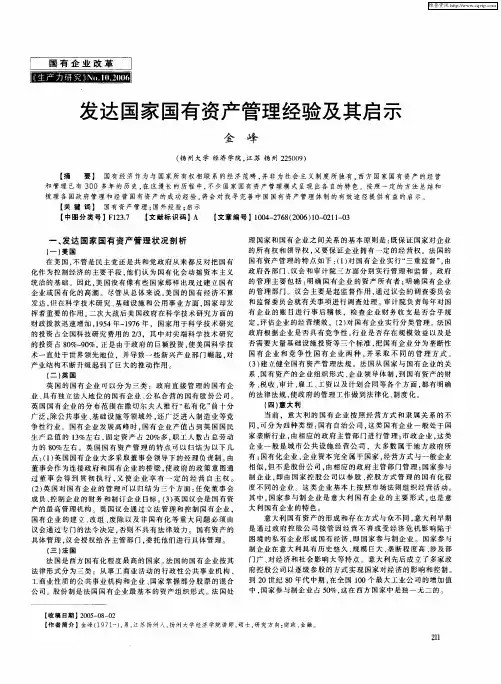 国外国有企业管理的借鉴与启示作者:林修凤游栋明来源:《现代企业》2008年第11期国有企业作为一种经济现象,不仅在社会主义国家大量存在,在资本主义国家也普遍存在,所不同的仅是比重和地位有区别。