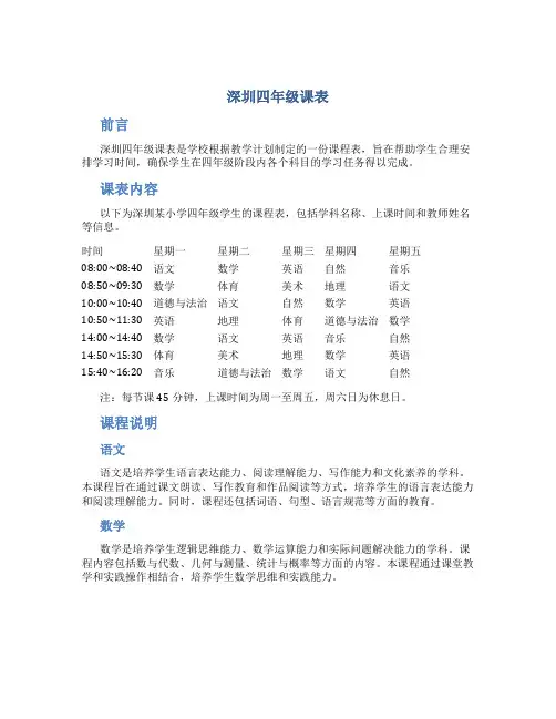 课表内容以下为深圳某小学四年级学生的课程表,包括学科名称、上课时间和教师姓名等信息。