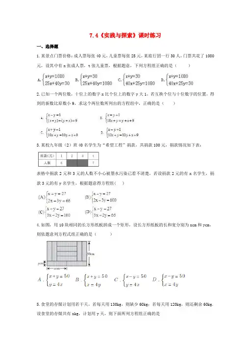 7.4《实践与探索》课时练习一、选择题1.某景点门票价格:成人票每张40元,儿童票每张25元,某旅行团一行30人,门票共花了1080元,设其中有x张成人票,t张儿童票,根据题意,下列方程组正确的是()2.已知一个两位数,十位上的数字x比个位上的数字y大1,若互换个位与十位数字的位置,得到的新数比原数小9,求这个两位数所列出的方程组中,正确的是()3.某校九年级(2)班40名学生为“希望工程”捐款,共捐款100元,捐款情况如下表:表格中捐款2元和3元的人数不小心被墨水污染已看不清楚,若设捐款2元的有x名学生,捐款3元的有y名学生,根据题意得方程组( )4.如图,用10块相同的长方形纸板拼成一个矩形,设长方形纸板的长和宽分别为xcm和ycm,则依题意列方程式组正确的是()5.食堂的存煤计划用若干天,若每天用130kg,则缺少60kg;若每天用120kg,则还剩余60kg.设食堂的存煤共有xkg,计划用y天,则下面所列方程组正确的是A.6013060120x y x y +=⎧⎨-=⎩B.6013060120x y x y -=⎧⎨+=⎩C.6013060120y x y x +=⎧⎨-=⎩D.6013060120y x y x -=⎧⎨+=⎩6.植树节这天有20名同学种了52棵树苗,其中男生每人种树3棵,女生每人种树2棵.设男生有x 人,女生有y 人,根据题意,下列方程组正确的是( )A.⎩⎪⎨⎪⎧x +y =523x +2y =20B.⎩⎪⎨⎪⎧x +y =522x +3y =20C.⎩⎪⎨⎪⎧x +y =202x +3y =52D.⎩⎪⎨⎪⎧x +y =203x +2y =52 7.为了改善全县中、小学办学条件,计划集中采购一批电子白板和投影机,已知购买2块电子白板比购买3台投影机多4000元,购买4块电子白板和3台投影机共需44000元,则购买一块电子白板和一台投影机分别需要( )A.4000元,8000元B.8000元,4000元C.14000元,8000元D.10000元,12000元8.一个两位数,十位上数字比个位上数字大2,且十位上数字与个位上数字之和为12,则这个两位数为( )A.46B.64C.57D.75 9.根据以下对话,可以求得小红所买的笔和笔记本的价格分别是( )A.0.8元/支,2.6元/本B.0.8元/支,3.6元/本C.1.2元/支,2.6元/本D.1.2元/支,3.6元/本10.《九章算术》中的“方程”一章中,一次方程组是由算筹布置而成的.《九章算术》中的算筹图是竖排的,为看图方便,我们把它改为横排,如图(1)(2),图中各行从左到右列出的算筹数分别表示未知数x ,y 的系致与相应的常数项,把图(1)所示的算筹图用我们现在所熟悉的方程组形式表述出来就是,类似地,图2(2)所示的算筹图我们可以表述为( ).二、填空题11.用彩色和单色的两种地砖铺地,彩色地砖14元/块,单色地砖12元/块,若单色地砖的数量比彩色地砖的数量的2倍少15块,买两种地砖共用了1 340元,设购买彩色地砖x块,单色地砖y块,则根据题意可列方程组为__________.12.甲、乙两码头相距100千米,一艘轮船往返两地,顺水航行需要4小时,逆水航行需要5小时.设这艘轮船在静水中的航速为x千米/时,水速为y千米/时,根据题意列出的方程组是__________.13.某次知识竞赛共出了25道题,评分标准如下:答对1题加4分;答错1题扣1分;不答记0分.已知小明不答的题比答错的题多2道,他的总分为74分,则他答对了题.14.有甲、乙、丙三种货物,若购甲3件,乙7件,丙1件,共需315元;若购甲4件,乙10件,丙1件,共需420元。