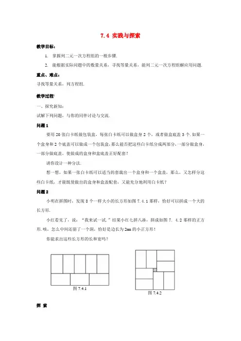 7.3 实践与探索教学示例4(问题2)一、教学目标1.让学生应用二元一次方程组的知识去探索和解决生活中的实际问题,学会将实际问题转化为数学模型.2.让学生经历由实际问题转化为数学模型的过程,领悟数学建模思想,体会如何寻找实际问题中的等量关系来建立二元一次方程组.3.通过合作交流让学生进一步感知方程组的应用价值,培养学生的创新意识和实践能力,通过交流互动,逐步培养合作的意识及严谨的治学精神.二、教学过程师:现在老师这儿有三个完全一样的小长方形,你是否可以利用它们拼成一个大长方形?请同学们拿出手中的那组长方形,动手拼一下,有几种不同的拼法?同学们开始动手拼,并将不同的拼法贴到了黑板上.图(1)图(2)图(3)师:你是否还有不同的拼法?请同学们看黑板上三位同学拼的,图(1)、图(3)在日常生活中经常见到,图(2)拼得比较特殊一些,这堂课我们就来研究这样的图形.(板题)师:从图形(2)中你能发现什么?为了说话方便,我们设小长方形的长为x ,小长方形的宽为y .生1:y x 2=.师:你还能发现什么?以前我们研究长方形主要研究它的什么?生齐答:长方形的长、宽、周长、面积.师:那么新长方形的长、宽、周长、面积与y x 、是否有关系,有什么关系? 生2:小长方形的长y x +=生3:小长方形的宽x =或y 2.师:还有什么发现?生4:大长方形的面积xy 3=.师:你可以解释一下吗?生5:大长方形是由三个小长方形组成的,每个小长方形的面积为xy ,那么大长方形的面积为xy 3.师:同学们还有什么发现?现在有这样一个问题请大家思考一下:是否任意三个完全一样的小长方形一定能够拼成如图(2)所示的图形?生齐答:不一定.师:那么什么样的长方形一定可以拼成这样的图形?(师手指黑板上的图) 生6:长与宽的比为2:1.师:现在老师这儿还有一组小长方形,同学们一起来看一下.教师从中拿出三个长方形在黑板上仿照拼好的模式拼.师:这样的三个长方形就拼不成那样的图形,说明这个长方形有什么特性? 生7:长与宽的比不是2:1.师:同学们回答得非常好.现在老师想接着拼,拼成图(2)那样的模式,同学们估算一下横着还需放几个?竖着还需放几个?生8:横着还需放三个,竖着还需放两个.师:请同学们拿出手中较小那组长方形,动手拼一下,验证你的猜想.哪位同学到黑板上接着拼完这个图形?同学们从袋中拿出小长方形动手拼图,验证猜想.一位同学到黑板上接着演示.师:你们猜的与拼的一样吗?很好,下面我们一起来看一下电脑的演示.师生一起看电脑演示下图.师:从这个图中你又能发现什么?为了说话方便,我们设小长方形的长为x ,宽为y .生9:y x 53=.师:同意吗?我们一起来看一下电脑演示.你是否还有其他的发现?生10:大长方形的长x 3=或y 5.师:我们接着来看演示,你还有其他发现吗?生11:大长方形的宽y x +=.师:好,我们接着来看演示,还有什么不同发现?生12:大长方形的面积xy 8=.师:同意吗?我们一起来看演示.屏幕上还有一种表示:大长方形面积x y x 3)(⨯+=对不对?怎么解释?生13:大长方形的长为x 3,宽为y x +,所以面积为x y x 3)(⨯+.师:很好,你还有什么发现?师:刚才拼图的时候我们使用了8个完全一样的小长方形,现在同样是这8个小长方形,老师还有这样一种拼法,清同学们仔细观察,从中你又能发现什么?师生一起看电脑演示,学生仔细观察.生14:我发现八个小长方形拼成了一个大正方形.师:你能简要说明一下为什么是正方形吗?生15:每条边长都是y x 2+,相等.师:很好,你还能发现什么?在拼的过程中中间有个空,你观察一下是什么形状? 生齐答:正方形.师:为什么?生16:每条边长都为x y -2.师:好,现在老师附加一个条件:已知小正方形边长为2cm ,你又能发现什么等量关系? 生17:22=-x y师:刚才我们是两个图形分开看的,而构成两个图形的基本元素一样,都是相同的小长方形,现在我们将两个图形放在一起联系起来考虑问题,你又能发现什么?生18:长方形的面积=+22正方形面积.师:是否可以用含y x 、的式子表示这个等式,如何表示?咱们一个一个来,长方形面积怎么表示?生19:x y x 3)(⨯+.师:那正方形面积怎么表示?生20:2)2(y x +.师:那么这个等式可以表示为22)2(23)(y x x y x +=+⨯+(电脑演示),这样表示行不行?生齐答:可以.师:刚才同学们通过观察发现了这么多问题,现在你是否可以从数学的角度提出一个问题,应用所学知识解决?学生先独立思考,然后讨论,在讨论中不同小组得出了不同结论.小组甲:可以求小长方形的长、宽.小组乙:可以求大长方形的周长、面积.小组丙:可以求大正方形的周长、面积.师:那么请同学们拿出作业本,一起求解一下小长方形的长、宽,求得快的同学接着求周长等,哪位同学可以上黑板板书?一位同学板书,其余同学动笔求解.教师巡视指导方法.师:好,请同学们停笔,一起来看一下黑板上这位同学做的,你能讲解一下吗?生21:根据拼法(1)有y x 53=,根据拼法(2)有22=-x y ,求出6,10==y x .师:同学们听清了吗?刚才老师在下面看见有的同学列了这样的方程:22)2(23)(y x x y x +=+⨯+。