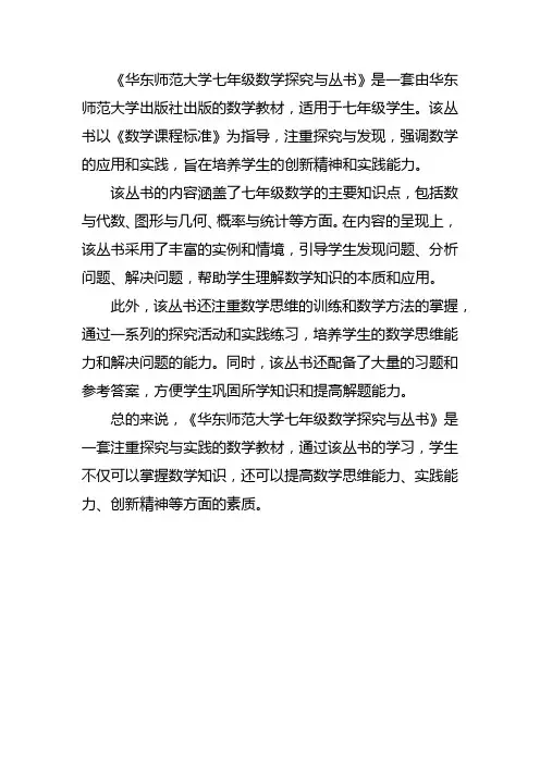 总的来说,《华东师范大学七年级数学探究与丛书》是一套注重探究与实践的数学教材,通过该丛书的学习,学生不仅可以掌握数学知识,还可以提高数学思维能力、实践能力、创新精神等方面的素质。