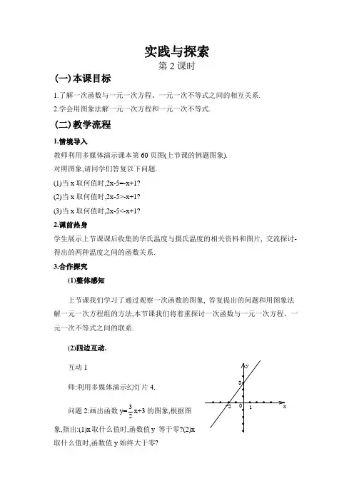 实践与探索第2课时(一)本课目标1.了解一次函数与一元一次方程、一元一次不等式之间的相互关系.2.学会用图象法解一元一次方程和一元一次不等式.(二)教学流程1.情境导入教师利用多媒体演示课本第60页图(上节课的例题图象).对照图象,请同学们答复以下问题.(1)当x取何值时,2x-5=-x+1?(2)当x取何值时,2x-5>-x+1?(3)当x取何值时,2x-5<-x+1?2.课前热身学生展示上节课课后收集的华氏温度与摄氏温度的相关资料和图片, 交流探讨-得出的两种温度之间的函数关系.3.合作探究(1)整体感知上节课我们学习了通过观察一次函数的图象, 答复提出的问题和用图象法解一元一次方程组的方法,本节课我们将着重探讨一次函数与一元一次方程、一元一次不等式之间的联系.(2)四边互动.互动1师:利用多媒体演示幻灯片4.问题2:画出函数y=32x+3的图象,根据图象,指出:(1)x取什么值时,函数值y 等于零?(2)x 取什么值时,函数值y始终大于零?生:动手操作,讨论交流解答的结果.师:由问题2,想想看,一元一次方程32x+3=0的解,不等式32x+3>0 的解集与函数y=32x+3的图象有什么关系?说说你的想法,并和同学讨论交流.生:分组讨论交流后,再在全班展开交流,让全体同学达成共识.明确教师利用多媒体演示画出的函数图象,如以下图.由图象可知: 当x=-2时,函数值等于零;当x>-2时,函数值始终大于零.归纳可得:从“数〞的角度来看,一次函数y=kx+b(k≠0)的函数值是0时,对应的x的值就是一元一次方程kx+b=0的解;当一次函数y=kx+b的值大于0时,对应局部x 的取值的集合,就是不等式kx+b>0的解集;当一次函数y=kx+b的值小于0时, 对应局部x的取值的集合,就是不等式kx+b<0的解集.从“形〞的角度看,直线y=kx+b(k≠0)与x轴交点的横坐标就是方程kx+b=0的解;直线y=kx+b位于x轴上方局部对应的x的值的集合,就是不等式kx+b>0的解集; 直线y=kx+b位于x轴下方局部对应的x的值的集合,就是不等式kx+b<0的解集.互动2师:在合作交流的根底上,请同学们从“数〞和“形〞的不同角度, 概括归纳本-节课开始提出的问题.生:讨论交流,达成共识.明确从“数〞的角度来看,当一次函数y=2x-5和y=-x+1的函数值相等时,对应的x的值就是方程2x-5=-x+1的解;当一次函数y=2x-5的函数值大于y=-x+1 的函数值时,对应的x的值的集合就是不等式2x-5>-x+1的解集;当一次函数y=2x-5的函数值小于y=-x+1的函数值时,对应的x的值的集合就是不等式2x-5<-x+1的解集.从“形〞的角度来看,直线y=2x-5和y=-x+1的交点的横坐标,就是方程2x-5=-x+1的解;直线y=2x-5位于直线y=-x+1上方局部对应的x的值的集合,就是不等式2x-5>-x+1的解集;直线y=2x-5位于直线y=-x+1下方局部对应的x的值的集合,就是不等式2x-5<-x+1的解集.互动3师:利用多媒体演示幻灯片.画出函数y=-2x+2的图象,观察图象并答复以下问题.(1)确定当0<y<2时,对应的自变量的取值范围;(2)确定当-1≤x<1时,对应的函数值的取值范围.生:动手画图,并答复以下问题,然后与相题.明确教师利用多媒体演示解答的过程和结果,验证学生的结论.依题意画出的函数图象如以下图,由图象观察可知:当0<y<2时,0<x<1;当-1<x<1时,0<y≤4.4.达标反响请解答课本第62页练习第1题和第2题.(教师在教室里来回巡视,进行必要的指点和帮助)5.学习小结(1)内容总结本课我们主要学习了哪些内容?(一次函数与一元一次方程和不等式的关系;用图象法解一元一次方程和不等式)(2)方法归纳一次函数、一元一次方程、一元一次不等式可以相互转化, 利用一次函数的图象可以解决一元一次方程或不等式问题, 有时也可以利用一元一次方程或不等式解决一次函数问题.(三)延伸拓展1.链接生活如以下图,一次函数y=kx+b的图象与反比例函数y=mx的图象相交于点A( --2,1),B(1,n).①根据条件,求一次函数与反比例函数的解析式;②根据图象写出使一次函数值大于反比例函数值的x的取值范围.答案:①y=-x-1,y=-2x, ②x<-22.实践探索(1)实践活动自编一道利用一次函数图象解决一元一次方程与一元一次不等式的题目.(2)稳固练习课本第64页习题第1-3题.(四)板书设计第1课时代数式的用法教学目标1.体会代数式的意义,形成初步的符号感;2.初步培养学生观察、分析、抽象、概括等思维能力和应用意识。