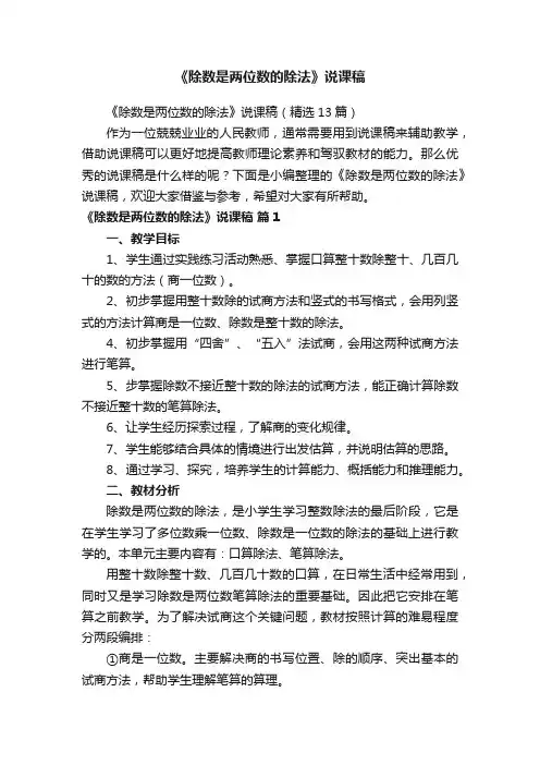 《除数是两位数的除法》说课稿《除数是两位数的除法》说课稿(精选13篇)作为一位兢兢业业的人民教师,通常需要用到说课稿来辅助教学,借助说课稿可以更好地提高教师理论素养和驾驭教材的能力。