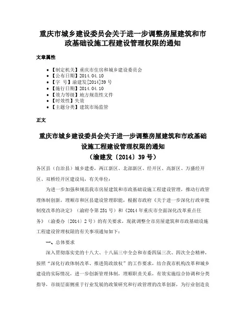 重庆市城乡建设委员会关于进一步调整房屋建筑和市政基础设施工程建设管理权限的通知文章属性•【制定机关】重庆市住房和城乡建设委员会•【公布日期】2014.04.10•【字号】渝建发[2014]39号•【施行日期】2014.04.10•【效力等级】地方规范性文件•【时效性】失效•【主题分类】建筑市场监管正文重庆市城乡建设委员会关于进一步调整房屋建筑和市政基础设施工程建设管理权限的通知(渝建发〔2014〕39号)各区县(自治县)城乡建委,两江新区、北部新区、经开区、高新区、万盛经开区、双桥经开区建设局,有关单位:为进一步加强和规范我市房屋建筑和市政基础设施工程建设管理,推动行政管理体制创新,理顺市和区县建设管理职能,根据市政府《关于进一步深化行政审批制度改革的决定》(渝府令第251号)和《2014年重庆市全面深化改革重点任务》(渝委办〔2014〕2号)的有关要求,现就调整全市房屋建筑和市政基础设施工程建设管理权限的有关事项通知如下:一、总体要求深入贯彻落实党的十八大、十八届三中全会和市委四届三次、四次全会精神,按照“深化行政体制改革、推进简政放权”的工作要求,结合我市机构改革和城乡建设的实际情况,进一步创新管理体制,理顺职责关系,有效实施综合协调和分类指导,市级层面侧重于行业发展的政策研究和行政管理的改革创新,为行业创造良好发展环境、提供优质公共服务、维护公平正义,区县层面侧重于各项政策的贯彻落实和现场的监督管理,逐步构建科学、合理、统一、高效的直辖市建设管理新格局。