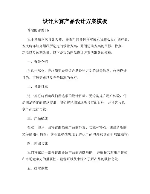 设计大赛产品设计方案模板尊敬的评委们:我于参加本次设计大赛,并希望向各位评审展示我精心设计的产品。