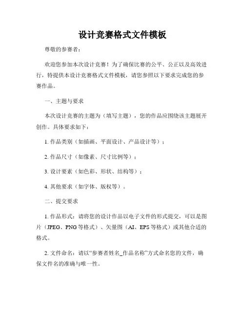 设计竞赛格式文件模板尊敬的参赛者:欢迎您参加本次设计竞赛!为了确保比赛的公平、公正以及高效进行,特提供本设计竞赛格式文件模板,请您参照以下要求完成您的参赛作品。
