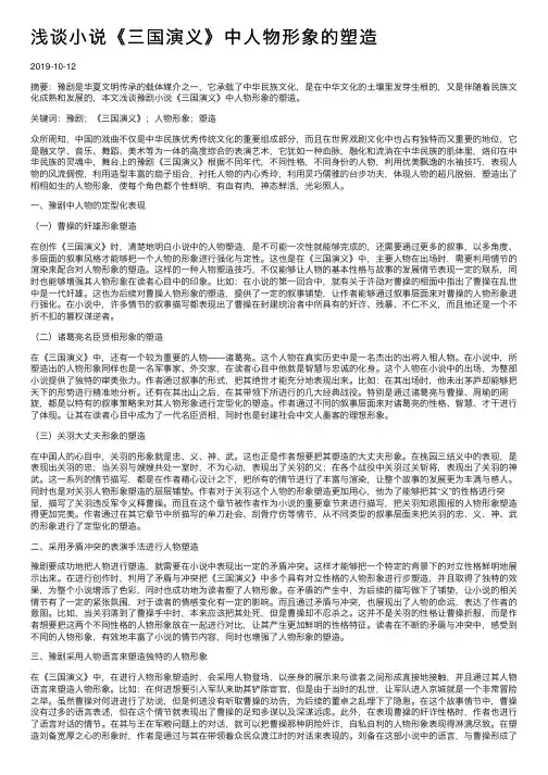 浅谈⼩说《三国演义》中⼈物形象的塑造2019-10-12摘要:豫剧是华夏⽂明传承的载体媒介之⼀,它承载了中华民族⽂化,是在中华⽂化的⼟壤⾥发芽⽣根的,⼜是伴随着民族⽂化成熟和发展的,本⽂浅谈豫剧⼩说《三国演义》中⼈物形象的塑造。