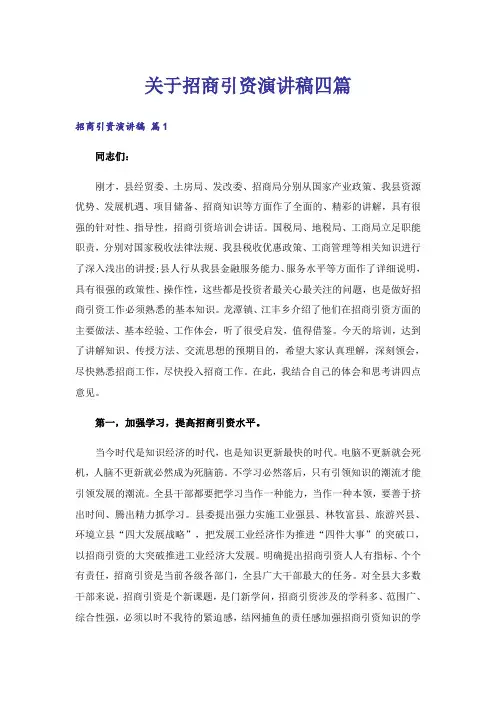 关于招商引资演讲稿四篇招商引资演讲稿篇1同志们:刚才,县经贸委、土房局、发改委、招商局分别从国家产业政策、我县资源优势、发展机遇、项目储备、招商知识等方面作了全面的、精彩的讲解,具有很强的针对性、指导性,招商引资培训会讲话。