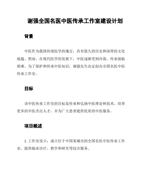 谢强全国名医中医传承工作室建设计划1. 项目背景和目标谢强全国名医中医传承工作室旨在传承和弘扬中国传统中医文化,提供专业的中医服务和培养优秀中医人才。