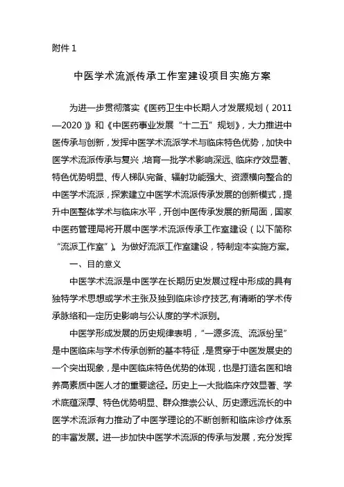 附件1中医学术流派传承工作室建设项目实施方案为进一步贯彻落实《医药卫生中长期人才发展规划(2011—2020)》和《中医药事业发展“十二五”规划》,大力推进中医传承与创新,发挥中医学术流派学术与临床特色优势,加快中医学术流派传承与复兴,培育一批学术影响深远、临床疗效显著、特色优势明显、传人梯队完备、辐射功能强大、资源横向整合的中医学术流派,探索建立中医学术流派传承发展的创新模式,提升中医整体学术与临床水平,开创中医传承发展的新局面,国家中医药管理局将开展中医学术流派传承工作室建设(以下简称“流派工作室”)。