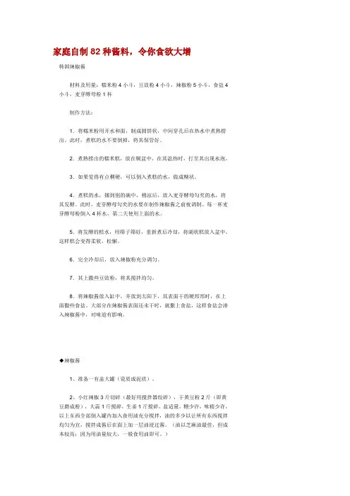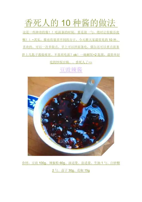 二、酱汁配料大全除了黄酱外,还有其他一些常见的酱汁配料可以用于调味和烹饪,下面我们来介绍一些常见的配料大全。