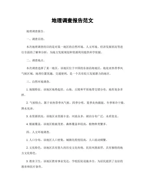 地理调查报告7篇(经典版)编制人:__________________审核人:__________________审批人:__________________编制单位:__________________编制时间:____年____月____日序言下载提示:该文档是本店铺精心编制而成的,希望大家下载后,能够帮助大家解决实际问题。