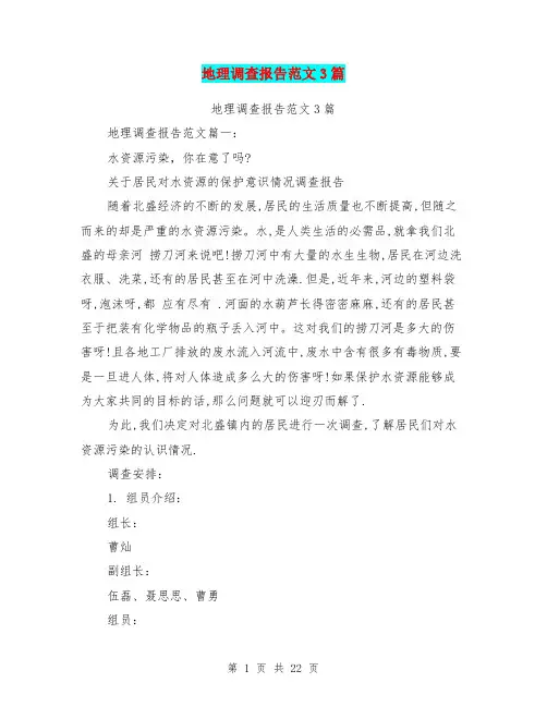 文档下载后可定制修改,请根据实际需要进行调整和使用,谢谢!并且,本店铺为大家提供各种类型的经典范文,如工作总结、工作计划、报告大全、心得体会、条据书信、合同协议、演讲稿、自我鉴定、其他范文等等,想了解不同范文格式和写法,敬请关注!Download tips: This document is carefully compiled by this editor.I hope that after you download it, it can help you solve practical problems. The document can be customized and modified after downloading, please adjust and use it according to actual needs, thank you!In addition, this shop provides you with various types of classic sample essays, such as work summary, work plan, report book, experience and experience, letter of agreement, contract agreement, speech draft, self-assessment, other sample essays, etc. I would like to know the different format And how to write, stay tuned!地理调查报告7篇下面是本店铺分享的地理调查报告7篇(自然地理调查报告),供大家阅读。