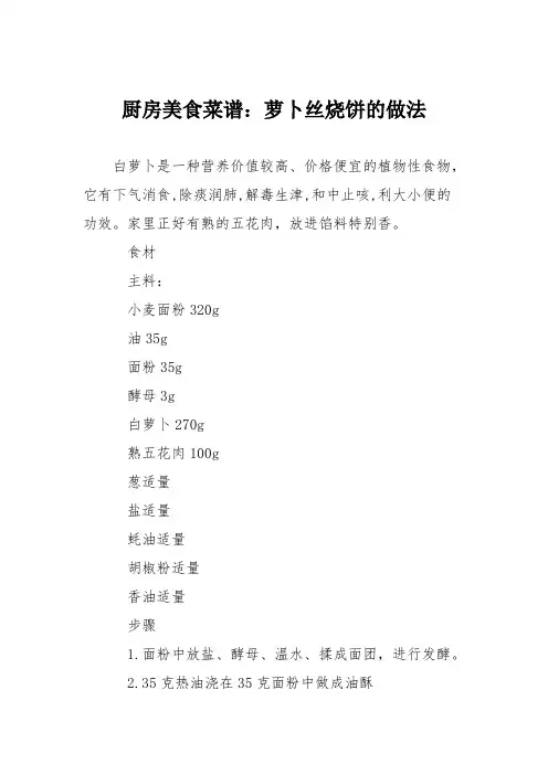 2、土豆丝煎饼1、大土豆两个削皮切丝,葱切末2、取鸡蛋四个打入盆内,加土豆丝搅匀(放适量盐)3、平锅烧热加油,摊上准备好的土豆丝(火不要太大),待饼成型后翻面4、土豆熟后即可盛盘3、煎土豆饼1. 土豆1斤洗干净削皮,刨成丝.2. 用厨房纸或布压干土豆里的水分.3. 加入2饭勺干面包屑,目的是吸干里头还有水分.4. 小洋葱一个切成细丝放到土豆丝里.5. 最后加入一只鸡蛋和适当的黑胡椒粉,盐一起拌好.平底锅烧热下油后, 把适当土豆丝放到上面, 压扁煎到两面金黄为止.馅饼的做法原料:面粉1斤,冷水6两,猪肉1斤,韭菜5两,香油、花生油、葱花、姜末、精盐、味精适量。