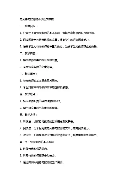 有关特岗教师的小学语文教案一、教学目标:1. 让学生了解特岗教师的基本概念,理解特岗教师的职责和使命。