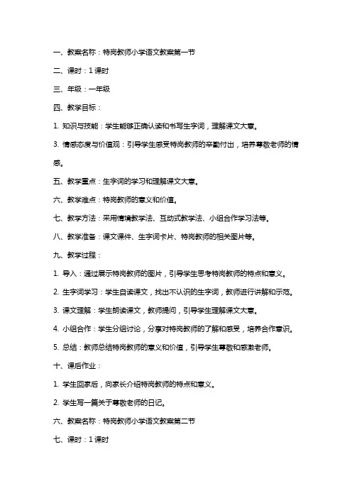 一、教案名称:特岗教师小学语文教案第一节二、课时:1课时三、年级:一年级四、教学目标:1. 知识与技能:学生能够正确认读和书写生字词,理解课文大意。