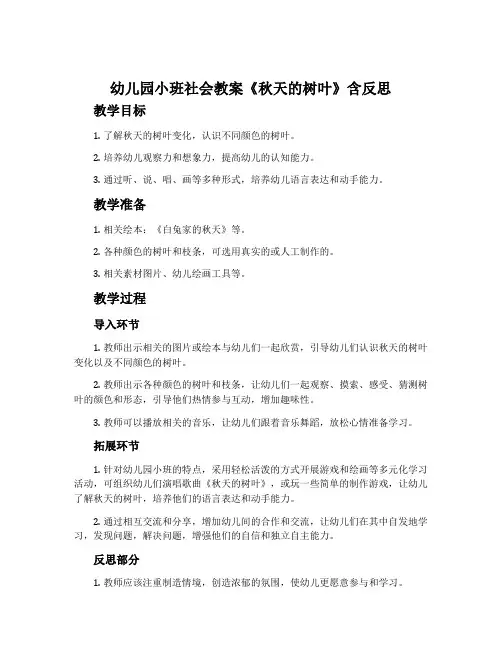 幼儿园大班教案《秋天的树叶》含反思一、教学内容本节课选自幼儿园大班教材《秋天的乐趣》第四章《秋天的变化》,详细内容为第三小节《秋天的树叶》。