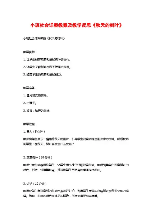 《秋天的叶子》教案及反思一、教学目标:1. 让学生观察秋天的叶子,感受大自然的美丽和季节的变化。