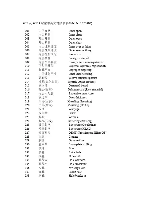 PCB及PCBA缺陷中英文对照表 (2010-12-10 205900)001内层开路Inner open002内层断路Inner short003外层开路Outer open004外层断路Outer short005内层蚀刻过度Inner over ecthing006外层蚀刻过度Outer over ecthing007内层树脂气泡Resin void008内层杂物Foreign material009内层图形移位Inner pattern mis-registration 010层与层移位Layer to layer mis-registration 011打孔不良Improper targeting012内层蚀刻不净Inner under etching013露布纹Weave textureexposure014檫花(氧化膜面)Scratch(Oxide surface)015板损坏Damaged board016分层(物料)Delamination (Raw material) 017内层不配套Excessive inner core018板过厚Over thickness019白点(压板)Measling (Pressing)020白点(喷锡)Measling (HSAL)021板曲Warpage022板焦黄Burnt023起皱Wrinkle024起泡(压板)Blistering (Pressing)025镀层起泡Blistering (Cu plating)026喷锡起泡Blistering (HSAL)027板面凹痕DENT (Pressing profilling GF) 028白斑Crazing029胶渣Gum residue030孔未穿Incomplete drilling031披锋Burr032多孔Extra hole033偏孔Hole shift034孔径大Hole oversize035孔径小Hole undersize036少孔Missing Hole037塞孔Block hole038崩孔Hole breakout039孔粗糙(镀铜)Hole roughness(Cu plating)040孔粗糙(机械钻孔)Hole roughness(mechanical drill) 041崩线、线路缺口Nick void on trace042缺口Nick void on pad043曝光过度Over-exposure044曝光不良Under exposure045显影不足Under develop046干膜脱落DF Peel off047干膜碎DF Rdsidue048干膜移位DF Mis-registration049标志不清(曝光)Illegible marking (exposure)050错菲林Wrong AW051非镀铜孔有铜Copper in NPTH052镀铜孔内无铜No copper in PTH053渗镀Nickel smear054电镀粗糙Rough plating055孔壁缺口Hole void (Cu)056金手指颜色不良Gold Finger discoloration057金面颜色不良Gold discoloration058金面阴阳色Two tone colour on gold surface 059铜、镍脱落Copper Nickel peel off060铜镀层厚度超要求Copper thickness out of requirement 061漏镀(金手指等)Skip plating(GF ENIG Cu)062金面污点Stain on gold surface063电镀针孔Plating pits (Cu)064镀锡缺点Tin plating defect065铜碎Copper residue066黑孔Black Hole067镀层白渍Plating haze068金手指凸出Protrusion (GF)069板污Board contamination070手指套Glove mark071褪锡不良Improper Tin stripping072微短路Micro short073粉红圈Pink ring074焊盘崩缺Broken annular ring075蚀刻不净Under etching076焊盘脱落Pad peel off077绿油上焊盘SM on pad078绿油图形移位Pattern mis-registration079绿油露线Expose trace080油薄Uneven SM thickness081入孔SM in hole082绿油冲板不良SM under develop083漏塞孔SM unplugged084IC栏不良Poor IC barrier085绿油脱落SM peel off086塞孔不满Incomplete SM plugging 087多开绿油窗Extra opening088溶剂测试失败Fail in solvent test089漏印Skip printing090水印Water mark091断绿油桥SM Bridge broken092绿油下氧化Oxidation under soldermask 093返工不良Poor rework094错油Wrong Ink095漏印字符Missing legend ink096字符入孔Legend in Hole097字符脱落Legend peel off098字符上焊盘Legend on pad099字符不清Illegible legend100日期不清Illegible date code101锣坑次品Milling Defects102啤板方向错Wrong punch direction103漏锣Missing routing104漏斜切Missing chamfering105斜边过度Over chamfefing106错外形尺寸Wrong outline dimension 107倒边不良Bevelling defect108金手指脱落Gold finger peel off109露镍、铜NiCu exposure110缺口Nick (GF)111涂层不良Poor ENTEK112锡上金手指Solder on GF113上锡不良(缩锡)Dewetting114不上锡(不沾锡)Non wetting115锡珠、锡堆Solder balllump116锡上线Solder on trace117针痕Pin mark118阻抗超出要求Impedance out of requirement 119工程试验Evaluation120微切片(出货)Microsection (outgoing)121微切片(工程试验用)Microsection (engineering)。