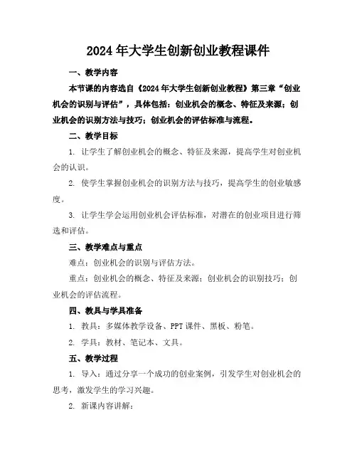2024年大学生创新创业教程课件一、教学内容本节课的内容选自《2024年大学生创新创业教程》第三章“创业机会的识别与评估”,具体包括:创业机会的概念、特征及来源;创业机会的识别方法与技巧;创业机会的评估标准与流程。