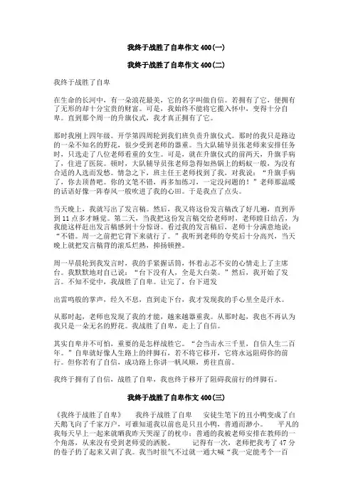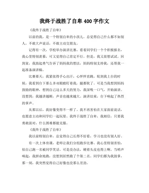 我终于战胜了自卑作文400(一)我终于战胜了自卑作文400(二)我终于战胜了自卑在生命的长河中,有一朵浪花最美,它的名字叫做自信。
