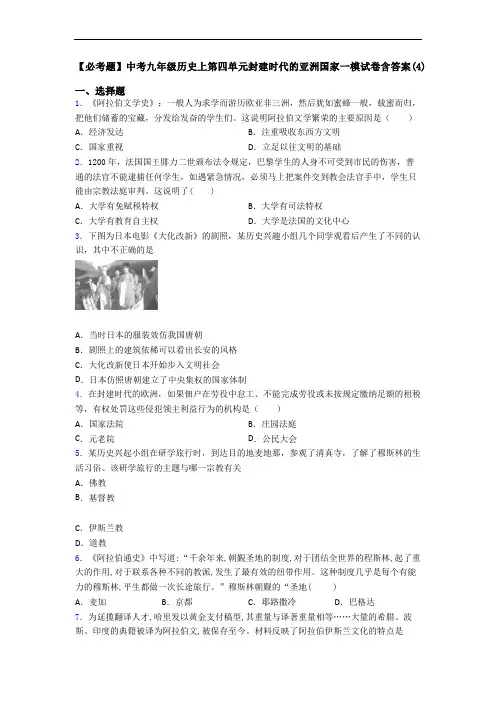 【必考题】中考九年级历史上第四单元封建时代的亚洲国家一模试卷附答案一、选择题1.构思巧妙、情节曲折、语言优美、脍炙人口,被高尔基称为世界民间文学创作中“最壮丽的一座丰碑”的是()A.《天方夜谭》B.《医学集成》C.《医典》D.《古兰经》2.据下图推知阿拉伯人对世界文明发展的贡献体现在A.处在世界中心B.沟通东西方文明C.科技水平先进D.文学成就巨大3.645年,孝德天皇在日本史上第一次使用年号“大化”。