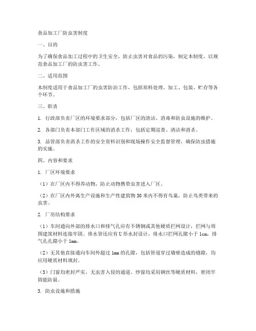二、适用范围本制度适用于食品加工厂的虫害防治工作,包括原料处理、加工、包装、贮存等各个环节。