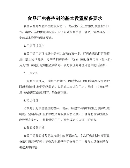 食品厂虫害控制的基本设置配备要求食品安全是社会关注的焦点之一,食品生产企业要做好虫害控制工作,确保产品的质量和安全。