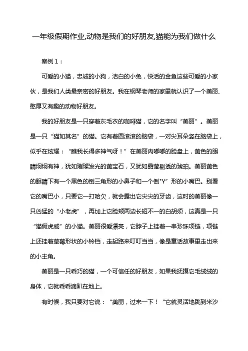一年级假期作业,动物是我们的好朋友,猫能为我们做什么案例1:可爱的小猫,忠诚的小狗,洁白的小兔,快活的金鱼这些可爱的小家伙,是我们人类最亲密的好朋友。