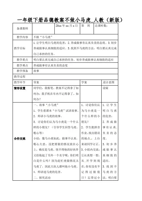 部编版一年级下册道德与法治第4课《不做“小马虎”》教案一、教学目标1.通过本节课的学习,使学生能够理解“小马虎”行为的概念,并正确评价。