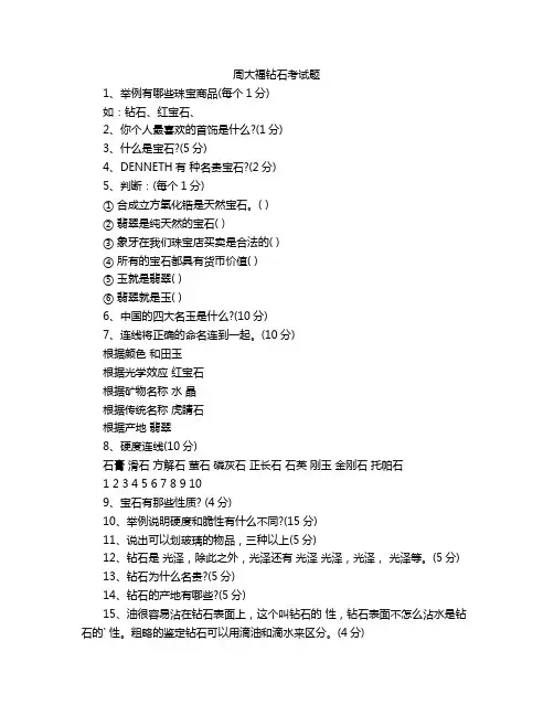 ------------珠宝鉴定试题一(A卷)一.是非题(每题一分共15分,每答错一题倒扣一分,不答不倒扣分)你认为是正确的在题后面的括号中写Y,你认为是错误的在题后面的括号中写N。