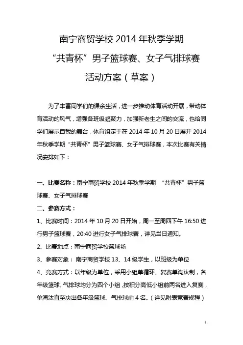 南宁商贸学校2014年秋季学期“共青杯”男子篮球赛、女子气排球赛活动方案(草案)为了丰富同学们的课余生活,进一步推动体育活动开展,带动体育活动的风气,增强各班级凝聚力,加强新老生之间的交流,也给同学们展示自我的舞台,体育组定于在2014年10月20日展开2014年秋季学期“共青杯”男子篮球赛、女子气排球赛,本次比赛有关情况安排如下:一、比赛名称:南宁商贸学校2014年秋季学期“共青杯”男子篮球赛、女子气排球赛二、参赛方式:1、比赛时间:2014年10月20日开始,周一至周四下午16:50进行男子篮球赛,20:40进行女子气排球赛,详见当日通知。