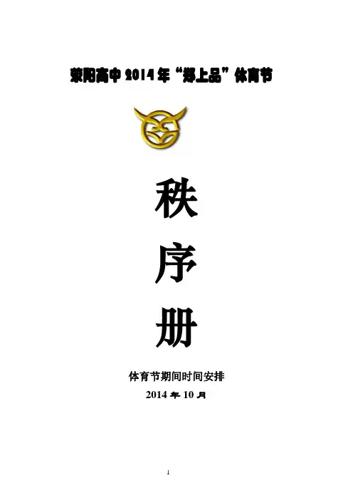 荥阳高中2014年“郑上品”体育节秩序册体育节期间时间安排2014年10月荥阳市高级中学2014年体育节组委会主任:崔永胜副主任:朱宏启王新亭张广林刘志睿委员:王利平薛胜占楚巍松王桂琴原文勇曹振武黄松峰李瑞东张玉川各班班主任纪律组织委员会:朱宏启张广林原文勇曹振武黄松峰张玉川许秋生侯志峰赵福对贾耀文陈振亭王金聚冯鹏翼吴占朝周宏伟各班班主任宣传组长:李毅成员:王辉张倩后勤组:程元章张遂柱孙伟峰医生:汪云峰摄影:平阳宁摄像:杨金城郭庆音响:王国栋苏浩朱伟峰器材组组长:荣海云成员:袁凤莲秦爱萍秦玉清张蕊胡艳丽李保红总裁判长:云培峰副总裁判长:马志峰张炜禹彦伟刘勇玺郭瑞径赛裁判长:马志峰刘勇玺检录主裁判:王建立检录员:穆磊雷慧杰宋争荣检查主裁判:刘元太检查员:程红军赵福对李巧莲王东顺张爱武张书强牛淑红徐燕蔡江艺王菊平发令主裁判:商会星发令裁判员:袁泉坤黑洪伟赵胜军终点主裁判:张炜计时长:马志峰计时员:苏晓琳黄静刘雪茹任东霞张丽刘晓静朱伟红刘娜于聪李霞吴志鹏闫书娟段红丽陈沛娟王超许琳霖王瑞萍闫利娜程玉武利霞周鹏飞李艳芳陈艳周佳终点记录主裁判:白俊鸽终点记录裁判员:杨艳川李建青张辉集体项目裁判长:禹彦伟张炜(兼)裁判员:张凤乔志红王伶俐姚丽许春霞王文娟商艳华赵玉环李金华张婷张淑娜侯宝娟孟繁蕾方丽萍张超(女)田赛裁判长:郭瑞跳部主裁判:王二军裁判员:龚佳丽马利平张秋芬马召郭振勇张念军李素敏张黎许冰董荃瑞张惠明掷部(含三级跳远)主裁判:孟蘩茹裁判员:赵颖超薛素芳张超秦妍李红岩于娜胡雯樊爱国陈辉李聪敏记录主裁判:王治国裁判员:商学进尚志武丁叶红董彩玲刘学珍魏淑月趣味运动会纪律组织:政教处人员王金聚冯鹏翼吴占朝周宏伟志愿者:学生20人仲裁委员会崔永胜朱宏启王新亭张广林刘志睿云培峰马志峰张炜禹彦伟郭瑞刘勇玺荥阳高中2014年秋季运动会“精神文明奖”评选办法细则一、纪检工作由校团委、学生会主要干部负责,每次两组交叉检查,检查方式为不定时抽检。