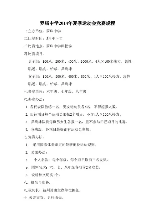 罗庙中学2014年夏季运动会竞赛规程一.主办单位:罗庙中学二.比赛时间:5月中下旬三.比赛地点:罗庙中学田径场四.比赛项目:男子组:100米、200米、400米、1000米、4人×100米接力、急性跳远、跳高、铅球、乒乓球女子组:100米、200米、400米、800米、4人×100米接力、急性跳远、跳高、铅球、乒乓球五.参赛单位:六年级、七年级、八年级六.参赛办法:1.各代表队教练一名,男女运动员各6名,不得超报人数。