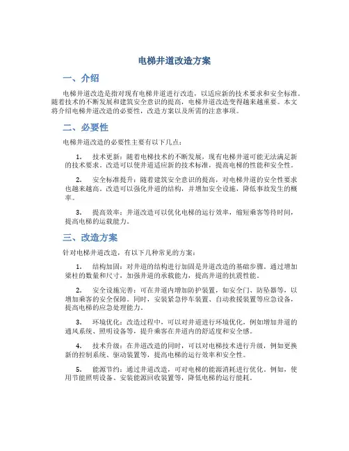 四、注意事项在进行电梯井道改造之前,需要注意以下几个方面:1.安全性:改造过程中,应严格遵守相关安全规范和操作规程,确保改造过程的安全性。