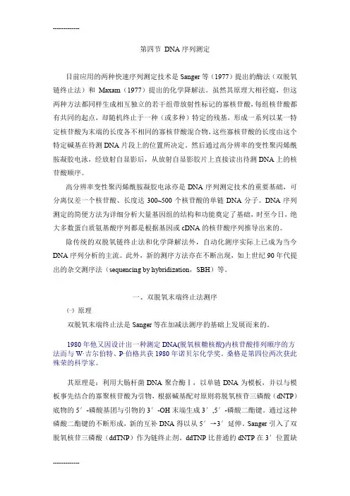 一、双脱氧末端终止法测序㈠原理双脱氧末端终止法是Sanger等在加减法测序的基础上发展而来的。
