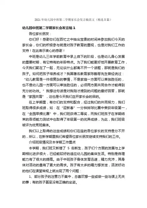 幼儿园中班下学期的家长会发言稿〔精选3篇〕幼儿园中班下学期的家长会发言稿〔精选3篇〕幼儿园中班下学期的家长会发言稿1各位家长:上午好!很快乐各位能在百忙之中抽空参加今天的家长会,同时也很感谢各位家长对我们的工作支持与配合,今天的家长会主要是向各位家汇报这半学期我们中班教学工作及每个孩子这半学期的成长情况。