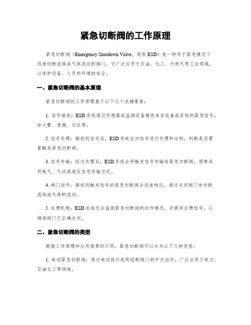 三、紧急切断阀的应用紧急切断阀广泛应用于各种工业领域,主要用于以下方面:1. 火灾安全:当发生火灾时,紧急切断阀可以快速切断供应燃料或氧气的管道,以防止火势蔓延。