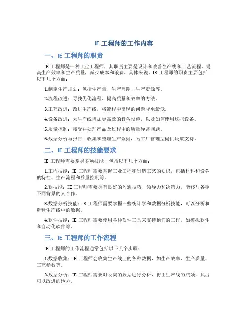 二、IE工程师的技能要求IE工程师需要掌握多项技能,包括以下几个方面:1.工程技能:IE工程师需要掌握工业工程和制造工艺的知识,包括材料和设备的特性、生产流程和质量控制等。