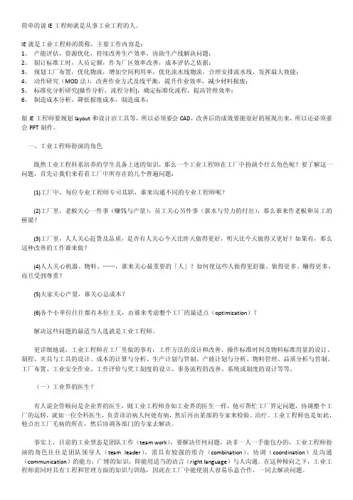 IE工程师的工作内容一、IE工程师的职责IE工程师是一种工业工程师,其职责主要是设计和改善生产线和工艺流程,提高生产效率和生产质量,减少成本和浪费。